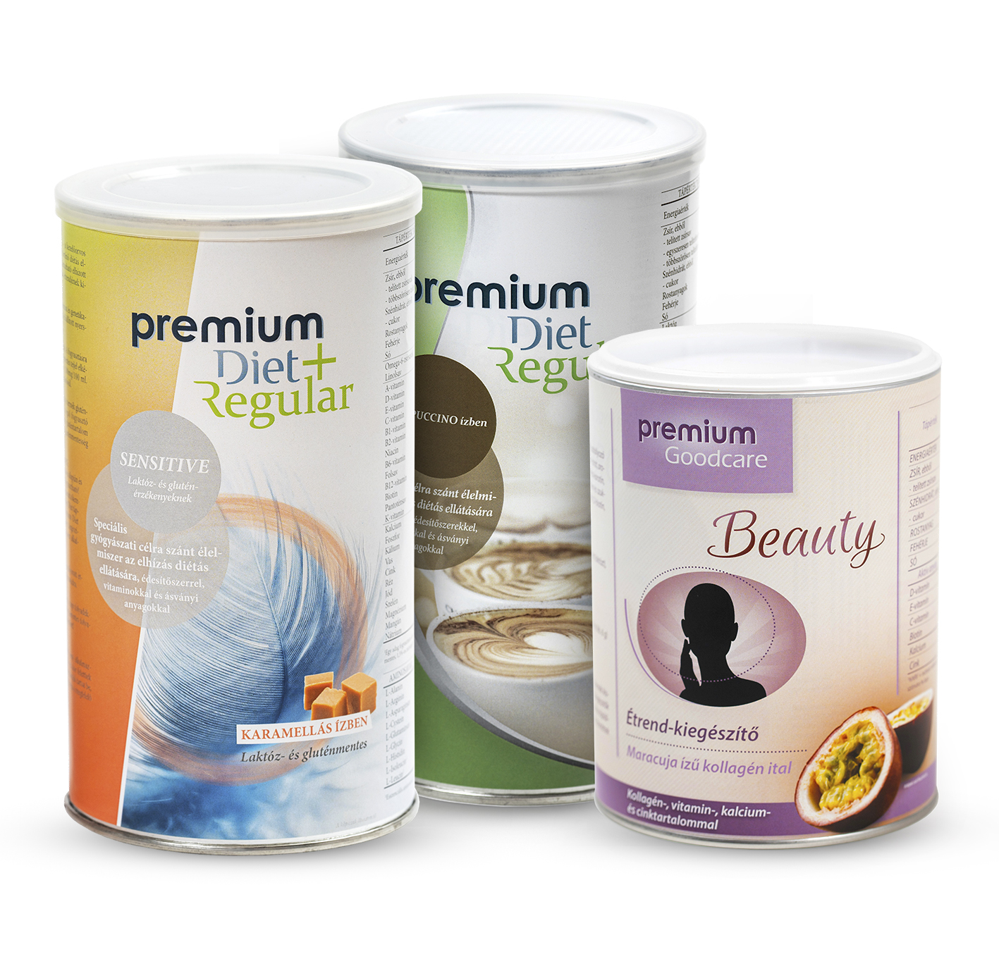 Premium Diet Regular Cappuccino, Premium Diet Regular+ Sensitive karamell és Premium Goodcare Beauty csomagban