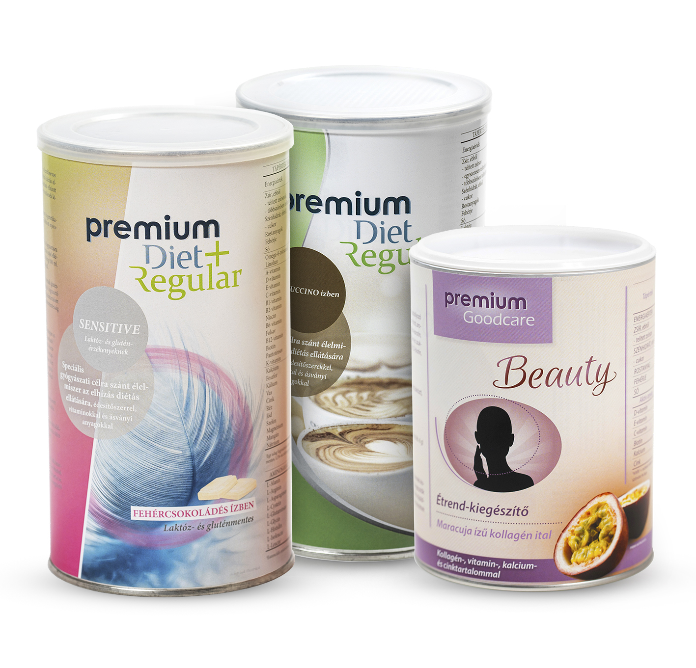 Premium Diet Regular Cappuccino, Premium Diet Regular+ Sensitive fehércsokoládé és Premium Goodcare Beauty csomagban