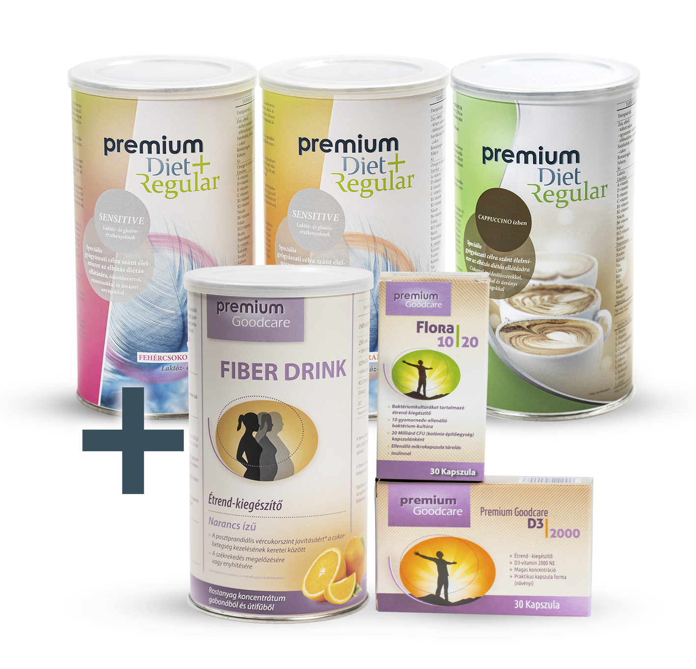 Premium Diet Regular Cappuccino, Premium Diet Regular+ Sensitive-ek (fehércsokoládé és karamell) AJÁNDÉK Premium Goodcare termékekkel csomagban