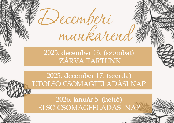 • 2025. december 13. (szombat) – zárva tartunk (csomagfeladás december 15. (hétfő))